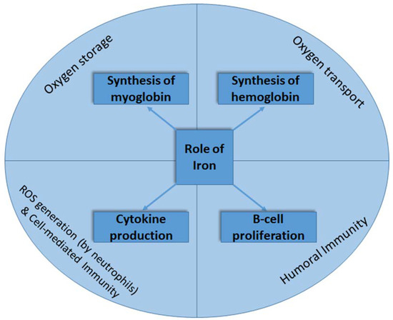 Iron is a trace element that is essential for its important physiological roles in regulating the biochemical pathways of different cellular processes [1,2,3], including the oxidative response of neutrophils [4], cytokine production as part of cell-mediated immunity, the proliferation of B-lymphocytes, and the generation of humoral immune responses [2] (Figure 1). Almost two-thirds of the iron in the body is found in the hemoglobin present in erythrocytes. The remaining iron in the body is bound to the myoglobin in muscle tissue, as well as different iron-containing enzymes [5].