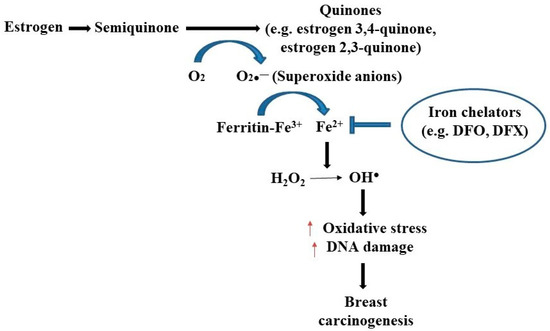 Iron overload due to increased absorption or other disorders can be detrimental and may lead to pathological conditions that include diabetes, cardiomyopathy, neurological disorders, and various types of human cancers such as colorectal, lung, and breast carcinomas [14,15]. In the case of iron overload, the capacity of transferrin to bind iron becomes saturated, causing iron to accumulate as nontransferrin-bound iron (NTBI). The accumulation of NTBI may have significant health hazards as NTBI has the ability to catalyze free-radical reactions [16]. In this way, iron overload may predispose to oxidant-mediated breast carcinogenesis [17,18]. In breast cancer, the iron-binding as well as iron-transporting proteins are often dysregulated. For example, hepcidin is found to downregulate ferroportin levels by the post-transcriptional modification of the later. The higher hepcidin and hence lower ferroportin levels, i.e., a high hepcidin/ferroportin ratio, eventually leads to an increase in ferritin expression and consequent iron overload [19,20]. Transferrin levels were also found to be altered in breast cancer cases [8,21,22]. Elevated concentrations of estrogen in breast tissue, which disrupts intracellular iron metabolism, results in excess iron that can initiate the generation of superoxide anions and the conversion of ferritin-bound Fe3+ to Fe2+, leading to estrogen-induced oxidative stress on nucleic acids followed by carcinogenesis (Figure 2) [23,24,25]. In addition, higher levels of free iron combined with other risk factors such as genotoxic metabolites of estradiol, alcohol consumption, and ionizing radiation can increase the likelihood of breast carcinogenesis [26]. Importantly, iron overload renders postmenopausal women more susceptible to breast cancer development by initiating and promoting oxidative stress [25,27]. A recent study has shown that an elevated iron levels within the inflammatory microenvironment of breast tissue may contribute to the progression and metastasis of breast cancer [28].