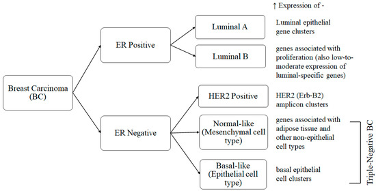Breast carcinoma intrinsic molecular subtypes. All these subtypes (2 ER positive and 3 ER negative, of which 2 are triple-negative) are characterized by higher expressions of different subsets of genes having distinct cellular phenotypes [35,36].