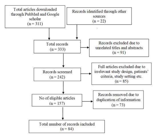 The PubMed and Google Scholar search parameters were set to the last 20 years. The search was performed from March 2021 to May 2022, with the last search being performed on 28 May 2022. The strategy involved searching the databases using the following Medical Subject Heading (MeSH) terms: ‘breast cancer’, ‘invasive breast cancer’, ‘targeted therapy’, ‘cancer stages’, ‘cancer type’, ‘primary therapy’, ‘iron overload’, ‘iron chelator’, ‘deferoxamine’, ‘deferasirox’, ‘NF-κB’, and ‘ROS’. A total of 333 records were identified. After the removal of 249 records due to irrelevant study design and duplication of information, 84 papers were included for this review (Figure 4). The inclusion criteria for the records were original articles, review articles, and websites focused on breast cancer diagnosis, prognosis, treatment, recent discoveries, and clinical case studies.