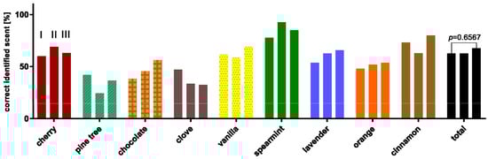Since olfactory perception is a phasic-tonic sensory stimulus, there would have been a likelihood that the participants would have performed worse due to the sequential study design [18]. For this reason, the correct answer rates of the control group were examined separately according to a scent and test approach. Only pine tree and cherry showed a poorer identification rate between the first and the third test approach as displayed in Figure 1. All these differences were not significant, and thus a bias in the study design could be excluded.
