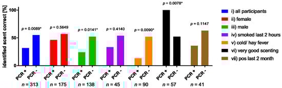 Comparison of identifications performance between subjects with molecular genetic evidence of SARS-CoV-2 and without. In addition to the total study population (i), males and females (ii,iii), as well as smokers (iv), participants suffering from allergies or cold (v), participants who considered their sense of olfaction to be very good (vi) and participants who had already tested positive for SARS-CoV-2 within the last 2 months (vii) were investigated separately. (* indicates significance throughout Fisher’s exact test).