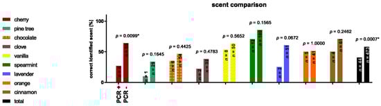 Percentage distribution of correctly identified scents, differentiated by molecular genetic testing result. This shows that the control (PCR negative) group achieves a better identification performance. (* indicates significance throughout Fisher’s exact test).
