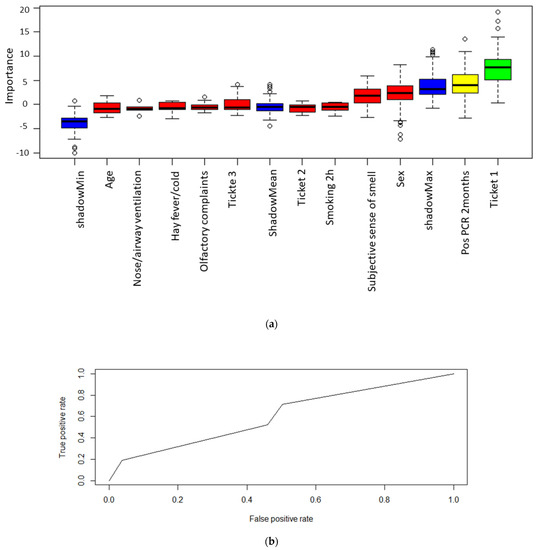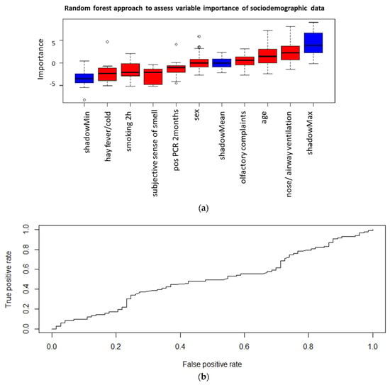For predicting a positive qRT-PCR result, the Boruta algorithm assigned high importance to the parameter “ticket_1” and a medium relevance to “positive qRT-PCR result 2 months ago” (Figure 4a). Logistic regression with both parameters was performed using the validation dataset. The results of the ROC analysis are shown in Figure 4b. The AUC of 0.61 was obtained for the prediction of a positive SARS-CoV-2 PCR by scenting tests and previous positive qRT-PCR result. In addition, we examined which clinical parameters influenced the correct identification of scents. Among the parameters age, gender, olfactory complaints, smoking within the last 2 h, subjective sense of smell, hay fever_cold, reduction of nasal ventilation, and positive SARS-CoV-2 qRT-PCR in the last 2 months, the random forest approach rated no parameter with high importance for the correct response of olfactory tests (Figure 5a). The application of all clinical variables in the prediction model showed an AUC of 0.5 (Figure 5b).