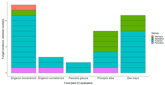 When analyzing the prevalence of the most abundant fungal genus (Fusarium) separately (Table 3), neither factor (host insect or food plant) attained statistical significance as a predictor of fungal incidence. However, for the most abundant species, a Fusarium species from the F. fujikuroi complex, its higher prevalence on the larvae fed with E. bonariensis was clear (Table 3).