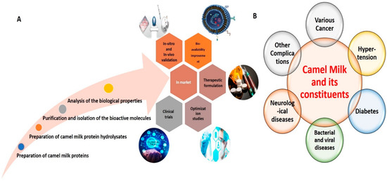 It has to be acknowledged that in the past, several studies have focused on camel milk components, such as proteins, carbohydrates, and fatty acids [22,24,32,33,34]. Yet, in recent years, CM components that have not previously been well appreciated, such as extracellular vesicles (EVs), have also been actively researched, supported by technological advancements [1,35]. Reckoning with these aspects in mind, in this review, we discuss recent trends in CM research endeavors and provide a perspective on the therapeutic efficacy of the nutritional and non-nutritional components of CM.