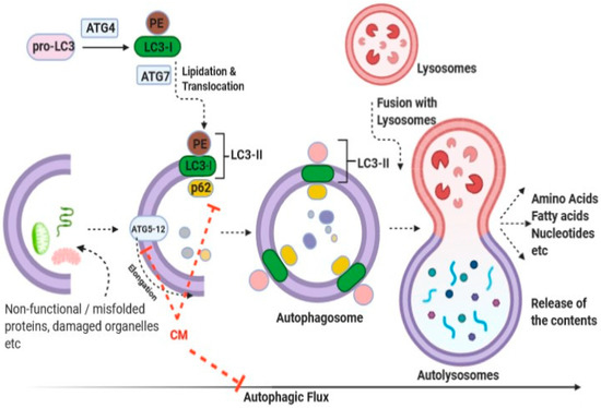 Representative image delineating the anti-cancer effect of CM against human colorectal and breast cancer cells through induction of autophagic responses (abbreviations are: LC3: a microtubule- associated protein 1 light chain 3 (LC3-I precursor); PE: phosphatidylethanolamine; LC3-II: Lipidated LC3-I; ATG4 and ATG7, autophagy proteins; ATG5-12, a complex of autophagy proteins; p62: sequestosome 1). Modified from Izadi et al., Journal of Functional food [24].