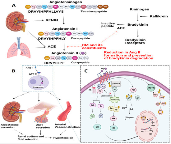 Representative image delineating the plausible anti-hypertensive effect of CM. At the molecular level, the renin-angiotensin system (RAS) is at the center of the regulation of hypertension. Angiotensin II (Ang II), an important effector RAS hormone, has been implicated in regulating the physiological effects of the regulation of blood pressure and is associated with the pathophysiology of hypertension. Basically, Ang II is derived from Ang I through the activity of Angiotensin Converting Enzyme (ACE). ACE, or kininase II, also plays a key role in the kallikrein-kinin system by cleaving bradykinin to inactive peptides; which, in turn, also affect hypertensive responses (A). Molecular signaling through AT1R is envisaged to mediate aldosterone secretion, ADH secretion, and the arterial vasoconstriction, which ultimately leads to hypertensive response (B). A detailed overview of the molecular signaling mediated by Ang II-AT1R is delineated (C). Interestingly, CM and its constituents have been reported to inhibit ACE.