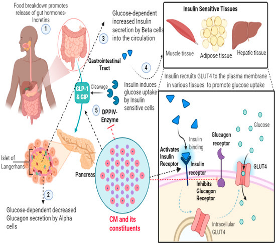 Representative image delineating the plausible anti-diabetic effect of CM. Food breakdown in the gastrointestinal tract (GI) leads to release of gut hormones, such as Glucagon-Like Peptide-1 (GLP-1) and Glucose Dependent Insulinotropic Polypeptide (GIP), which seemingly stimulate glucose-dependent insulin secretion by the pancreatic Beta cells. Insulin thereby promotes glucose uptake by the insulin sensitive tissues. Mechanistically, insulin, upon binding to insulin receptors, initiates a signaling cascade that eventually induces translocation of glucose receptors (GLUTs) to the membrane whereby glucose can be up-taken. These gut hormones are cleaved by DPP-IV enzymes which leads to attenuation of insulin secretion. Interestingly, CM and its constituents have been reported to activate GLP1/GIP and inhibit Dipeptidyl peptidase-IV (DPP-IV), activate insulin receptor and inhibit glucagon receptor. Additionally, it has been reported that CM embodies insulin-like peptides that mimic insulin responses, another aspect adding to their anti-diabetic potential.