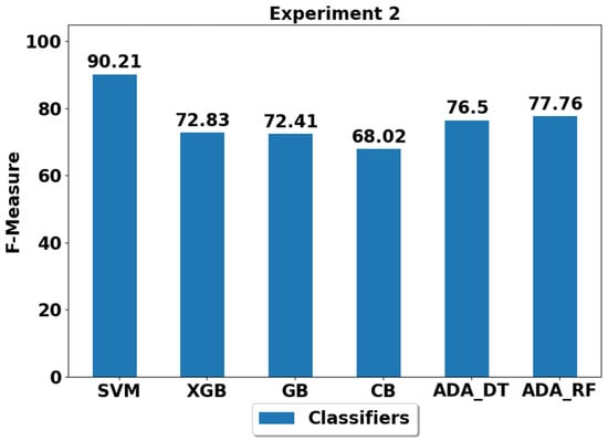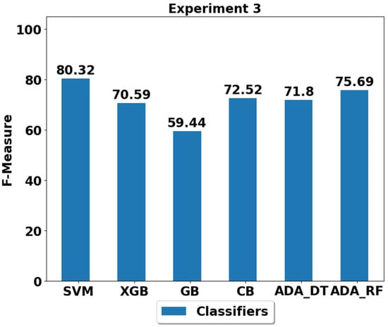 The performance achieved using various machine learning classifiers for seven experiments (E1–E7) are presented in Figure 3, Figure 4, Figure 5, Figure 6, Figure 7, Figure 8 and Figure 9, and the respective performance by classes are presented in Table A1, Table A2, Table A3, Table A4, Table A5, Table A6 and Table A7 in Appendix A.