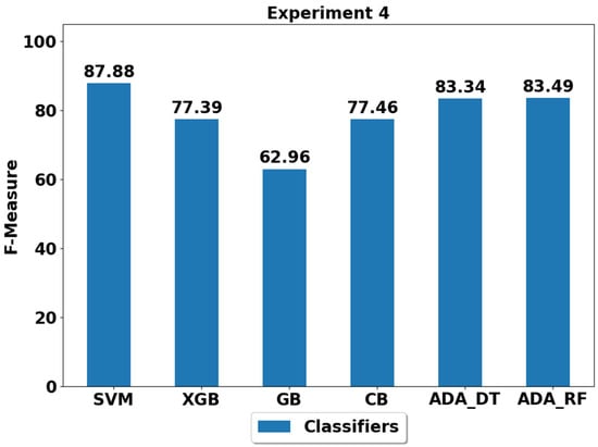 In experiment 4 (E4), walking, walking upstairs, walking downstairs and sitting are underrepresented and imbalanced as compared to other majority classes. The results shown in Figure 7 and Table A5 suggest that the SVM again outperformed all the other classifiers with an F-score of 81.7%, and ADA (RF) is the second-best classifier with an F-score of 78.02%.