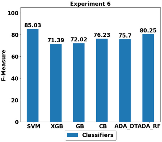 During experiment 6 (E6), all classes are underrepresented except the majority class represented class, which is lying. The performance analysis of the classifiers using the E6 train/test split is shown in Figure 8 and Table A6. All the classifiers are able to achieve the performance of above 70%. Similar to previous experiments’ results, SVM outperformed all the classifiers with performance of 85.03%, and the second-best performance was obtained by the ADA (RF) classifier.