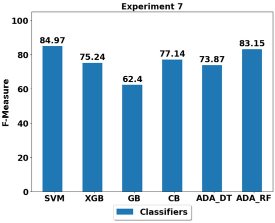 In experiment 7 (E7), all the classes are balanced with equal samples; however, the samples are very low (100, please see Table 2) when compared to the original samples (around 500 for each class, please see Table 2) in E1. Lower number of training samples can influence the performance of the machine learning classifiers since supervised machine learning is all about feeding sufficient data to the classifiers. Therefore, fewer samples mean fewer training opportunities for the classifier to estimate and quantify the underlying trends from the data. The performances of the different classifiers using the E7 dataset are depicted in Figure 9 and Table A7. The SVM and ADA (RF) classifiers performed well with the performance of 84.97% and 83.15%, respectively, while the lowest performance of 62.4% was achieved by the GB classifier.