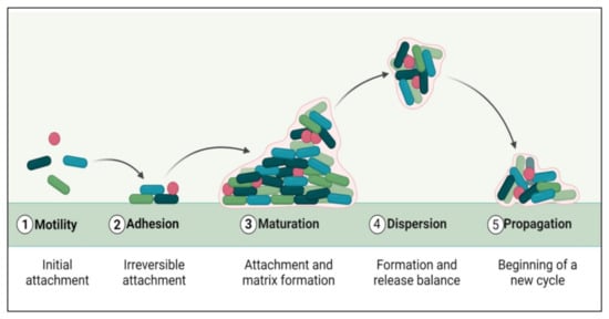 The biofilm formation and development process include five distinct phases (Figure 1). The initial step involves the microbial cells surface adhesion, followed by the growth and formation of mature biofilms [24]. Many factors, such as sedimentation, Van der Waals forces, hydrodynamic forces, Brownian movements, and electrostatic or hydrophobic interactions, mediate bacterial deposition [25]. Biofilm formation involves some surface-linked proteins such as protein A [26], SasG [27,28], fibronectin-binding protein [29], biofilm-associated protein (BAP) [30,31], and OmpA are involved in this initial phase of biofilm development. Some microbial species cannot adhere directly to a surface, but they can bind to cells or a matrix already present. Microbial cells in biofilms are ultimately encased in an extracellular matrix, a variable mixture of biomolecules such as nucleic acids, proteins, lipids, and polysaccharides [32]. Biofilm formation and maturation can be affected by QS, a cell–cell communication mechanism promoted via small signaling molecules [33].