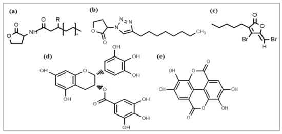 Chemical structures of some anti-biofilm compounds that inhibit AHL-mediated QS. (a) AHL, (b) triazole dihydro furanone, (c) synthetic halogenated furanone, (d) EGCG, (e) ellagic acid.