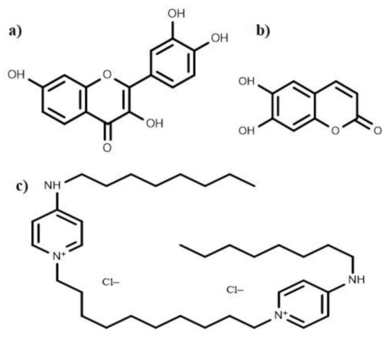 A flavonoid compound, quercetin (Figure 4a), also affects QS and acts as an antibiofilm molecule against S. aureus via inhibiting alginate production resulting in decreased attachment in biofilm formation. It is also responsible for reducing exopolysaccharide production (EPS), which is required for bacterial attachment and biofilm formation [121]. In addition to quercetin, two other synthetic flavonoids are also recognized as anti-biofilm agents by dispersing cells of S. aureus [122]. A phytochemical, curcumin (Figure 4b), isolated from Curcuma longa, manifests potential anti-biofilm activity by influencing the gene expression involved in the QS process and thus the development of virulence factors such as swarming movement and the production of alginate [123].