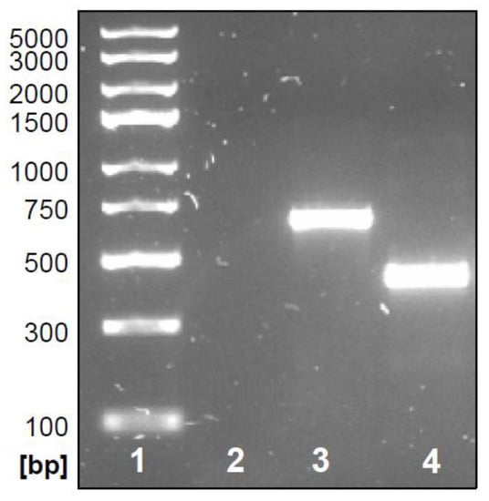 Agarose gel analysis of the obtained PCR products. Lane 1: DNA ladder; lane 2: no template control (NTC); lane 3: amplicon from T7pFw and gDc9Rev primer pair; lane 4: amplicon from gDc9Fw and gDc9Rev primer pair.