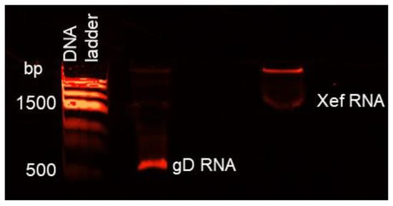 A volume of 2 μL of the PCR reaction was added as the DNA template in a volume of 20 μL in vitro transcription reaction set up with the bacteriophage T7 RNA polymerase and reagents from a commercial kit. In parallel, a linearized pTRI-Xef plasmid supplied in the kit was transcribed as the reaction control. Following the in vitro transcription, DNase was added to digest the DNA template, and the mixtures were purified by affinity RNA columns. Then, the in vitro transcribed RNA molecules corresponding to the selected region of the US6 gene for HSV-1 gD (gD-RNA-synt) were further analyzed by a 5% acrylamide/8M urea denaturing gel. As shown in Figure 2, both the gD-RNA-synt and the Xef-RNA control showed the expected sizes, at about 530 b and about 1.89 Kb, respectively. To ensure that possible contamination from the DNA template could not affect the subsequent phases of the assay, further DNA digestion and purification steps were performed before using the gD-RNA-synt.