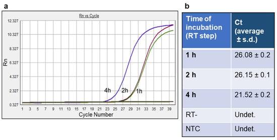 To define whether the time of the retrotranscription phase of the assay, performed using gD-RNA-synt as a template, could affect the Ct values obtained, experiments were conducted in which three different retrotranscription times were examined. Figure 3 shows the amplification curves obtained in a representative experiment by incubating 106 gD-RNA-synt molecules in the presence of 10−2 U of HIV RT for 1 h, 2 h, and 4 h at 37 °C. Following a further incubation for 5 min at 95 °C, the generated cDNAs were quantified by SYBR Green PCR, according to the general protocol. The results showed that an incubation time of 2 h did not create substantial improvements in the activity of retrotranscription compared to the incubation of 1 h. In contrast, the prolongation to 4 h of the retrotranscription reaction allowed the generation of greater quantities of cDNA, indicating that a single hour of incubation was not sufficient to highlight a fully completed reverse transcription activity using gD-RNA-synt at the selected reaction concentration. Thus, this aspect was also taken into consideration in the successive phases of the setting up of the assay.