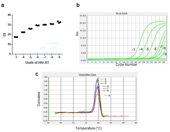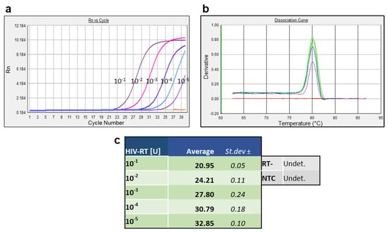 Thus, putting together the information collected during the different experimental phases of the study, the final step was to verify the threshold quantity of HIV-1 RT detectable with the optimized assay. For this purpose, a series of experiments were performed using 106 molecules of gD-RNA-synth as a template, 500 nM RT-primers, the selected reaction buffer, 0.1 mM dNTPs as reaction mixture, 4 h incubation for the amplification phase, and serial dilutions from 1 × 10−3 to 1 × 10−9 U of HIV-1 RT. As shown in Figure 7a, the identified conditions obtained amplification curves up to the samples in which an amount of 1 × 10−9 U of HIV-1 RT was added to the reaction mixture. In addition, the melting temperature analysis and the corresponding dissociation curves indicated that the amplified products were highly specific (Figure 7c).