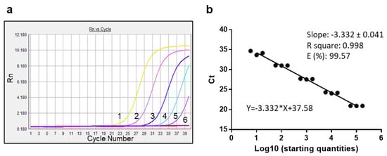 SYBR Green real-time PCR amplification efficiency. (a) Amplification curves obtained from tenfold dilutions of the cDNA corresponding to 105 molecules of template RNA. Identification numbers reported in Table 2. (b) Serial dilutions of the cDNA template, corresponding to the identification numbers reported in Table 2, were used and assayed in triplicate. Each black circle refers to one of these assessments. The resulting Ct values are plotted against the Log10 of the starting quantity. Calculation of the slope, R2, and efficiency, are also reported.