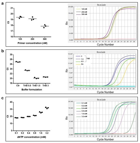 In the attempts to detect the smallest possible amount of RT activity, a series of experiments were then performed in which different conditions of a single component of the first phase of the assay, i.e., the retrotranscription reaction, other than the gD-RNA-synth template and the incubation time, were assayed. In this round of experiments, different concentrations of the specific RT primer (Figure 6a), different formulations of the reaction buffer (Figure 6b), and different amounts of the deoxyribonucleotide triphosphate (dNTPs) were tested. The results led to the identification of the optimal reaction conditions for the abovementioned three factors, as 500 nM for the concentration for the primer, as Triton 0.1 mM and MgCl2 1.5 mM % for the buffer, and to an amount of 0.1 or 0.2 mM for the dNTPs, as shown by the amplification curves located to the left side of the graphs (Figure 6).