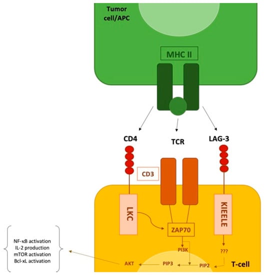 The intracellular portion of LAG3 is not yet well known and contains a unique region known as KIEELE, which is necessary for the inhibitory function of T lymphocytes through a possible blockage of the S phase of the cell cycle and, subsequently, cell division (Figure 1). However, the exact mechanisms by which LAG3 inhibits T cell function are not completely known, and the intracellular ligands of KIEELE have not yet been identified [109,110,111,112].