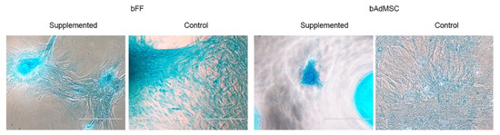 To evaluate the plasticity of bFFs and bAdMSCs, the cells were induced to chondrogenic lineage. The analysis of cell differentiation was performed based on the morphological comparison between the supplemented cells and the control cells (Figure 1). The cells submitted to chondrogenesis formed a cell mass stained by Alcian Blue, diverging from the control cells, which maintained their typical spindle-shaped morphology.