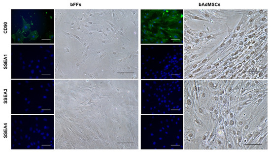 Positive detection of the CD90 marker and negative for SSEA-1, SSEA-3, and SSEA-4 in bFFs and bAdMSCs. Nuclei labeled with Hoechst. Scale bar 200 µm.
