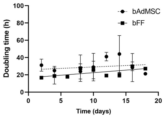 bFFs presented a shorter doubling time (Figure 3), approximately 22 h, compared to adipose tissue cells, which presented a doubling time of approximately 29 h (p = 0.0096).