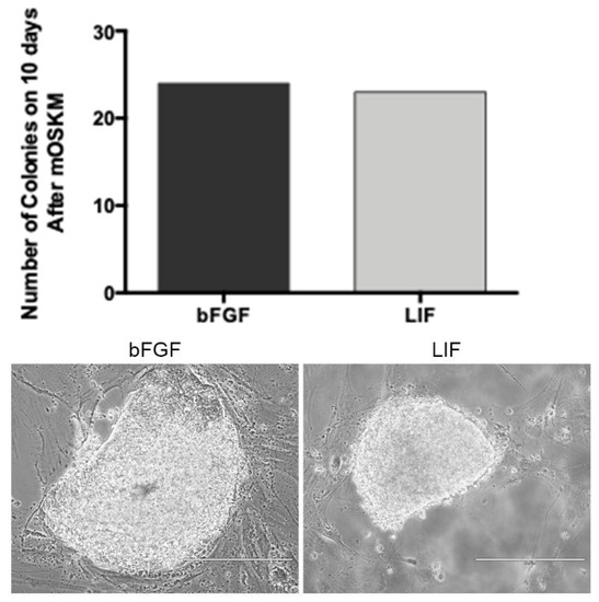 After six days, the cells were harvested using Tryple Express (Life Technologies) and 2 × 104 cells/well were plated onto feeder layers of mitomycin C-treated mouse embryonic fibroblasts (MEFs) in iPSCs media composed of KnockOut Dulbecco’s modified Eagle’s medium (DMEM/F-12, Life Technologies), supplemented with 20% KnockOut Serum Replacement (KSR, Life Technologies), 1% L-glutamine (Life Technologies), 1% nonessential amino acids (Life Technologies), 1% antibiotics (pen/strep, Life Technologies), and 3.85 μM β-mercaptoethanol (Life Technologies). Media culture was supplemented with 10 μg/mL human bFGF (PeproTech, East Windsor, NJ, USA) or 1000 U/mL LIF (Merck, Temecula, CA, USA).