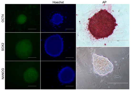 For alkaline phosphatase (AP) detection, the commercial Alkaline Phosphatase Detection Kit (86R-1KT, Sigma-Aldrich) was used. Briefly, colonies were fixed and analyzed according to the manufacturer’s instructions. Colonies stained in pink were considered positive. AP positive clonal lineages were further analyzed for the detection of NANOG, OCT4, and SOX2.