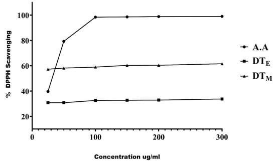 Phytobiologics have immense therapeutic significance; therefore, the prepared ethanolic and methanolic extracts of the plant were screened for their presence. Both the extracts had a plethora of medicinally important phytobiologics, as shown in Table 1. Alkaloids, flavonoids, tannins, glycosides, steroids, sterols, and triterpenes were common to both the extracts, whereas coumarins and glycosides were exclusive to methanolic extract (DTM) and leucoanthocyanins, and phenols and diterpenes were unique to the ethanolic extract (DTE). Six different concentrations of both the extracts were tested to assess the radical scavenging of the extracts. An increase in scavenging activity was observed with increasing concentrations of the extracts. The extracts, however, were less active in scavenging free radicals compared to ascorbic acid a highly antioxidant compound used as a standard in this experiment (Figure 1).