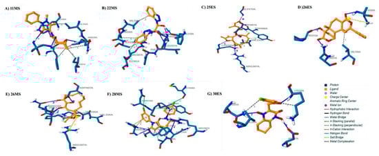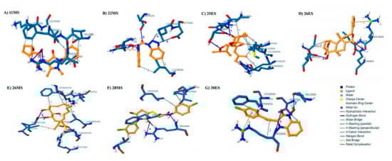Docked poses and molecular interactions of the proposed inhibitors with HK2. Interaction analysis of inhibitors (brown) at the binding site of HK2 (blue) visualized by protein ligand interaction profiler: (A) 11MS, (B) 22MS, (C) 25ES, (D) 26ES, (E) 26MS, (F) 28MS, and (G) 30ES.