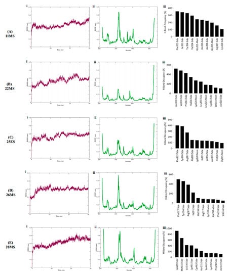 Similar to HK2, both new and old bonds were detected for all the phytobiological inhibitors against GLS1. The hydrogen bond analysis of GLS1 inhibitors demonstrates that 28MS and 22MS formed the greatest number of stable bonds with the highest occupancy as opposed to the others. For inhibitor 11MS, the only hydrogen bond that was retained from docking with a relatively lower occupancy was formed by Lys320. All other detected bonds were new and were formed during the simulation. Phe322, Ile391, and Tyr394 formed the most stable high occupancy H-bonds for 11MS (Figure 5Aiii). The hydrogen bond formed by Lys 320 was also preserved for 22MS in addition with Leu321. Other stable high occupancy bonds for 22MS were owed to amino acids Asn331, Val334, Pro313, and His330 (Figure 5Biii). For 25ES and 26MS, hydrogen bonds formed by Lys320, and Phe318 were the only ones found to be common to both docking and simulation. However, the retention of the hydrogen bond detected with Arg387 was observed only for 25ES but not 26MS. New bonds for both these inhibitors were found with amino acids Phe322 and Tyr394 (Figure 5Ciii,Diii). The phytobiologic inhibitor 28MS formed the highest occupancy stable hydrogen bonds with GLS1, suggesting maximum inhibition of the target by this inhibitor. All the hydrogen bonds detected for this inhibitor except for Lys320 were newly established. The occupancy and stability of these new bonds was highest in contrast to all other inhibitors under investigation. The bonds executed by Lys289 and Met333 were the most notable ones for 28MS (Figure 5Eiii).