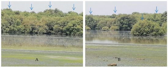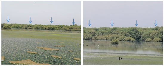 Four sites (A–D) with mangrove clumps (blue arrows) in Jazan region of Saudi Arabia as a source of endophytic fungi isolation.