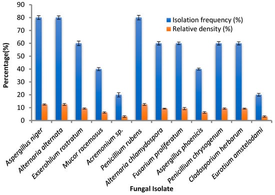 Isolation frequency and relative density % of the isolated endophytic fungi. Error bars represent the standard deviations.