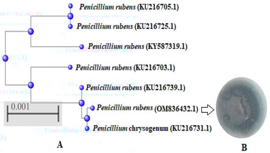 Identification of P. rubens (OM836432.1) with neighbor joining phylogenetic tree (A) and its colony (B). sharper.