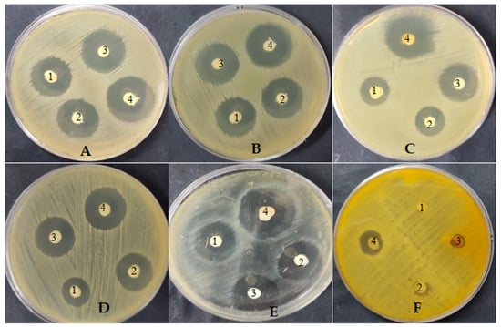 Antimicrobial activity of A. alternata (1), A. niger (2) and P. rubens (4) extracts and control (3) against B. subtilis (A), E. coli (B), P. aeruginosa (C), S. aureus (D), C. albicans (E) and A. fumigatus (F).