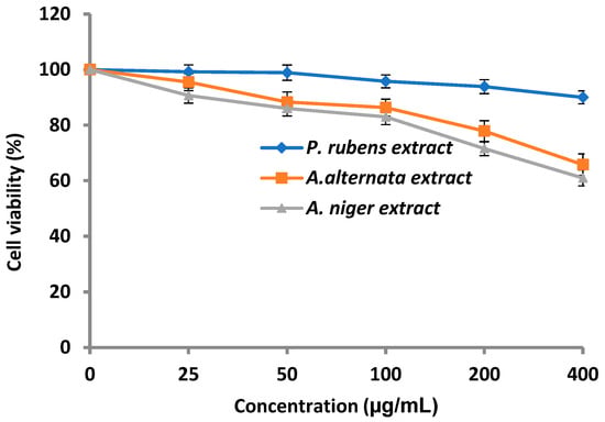 The cytotoxicity of P. rubens, A. alternata and A. niger extracts was evaluated against normal cells of human lung fibroblasts (WI-38 cell line) (Figure 8). The results indicated that P. rubens extract showed negligible cytotoxicity at concentrations up to 100 µg/mL and weak cytotoxicity at concentrations up to 400 µg/mL and reached 9.09% mortality, suggesting the possibility of further anticancer activity, as well as other pharmaceutical applications. On the other hand, the cytotoxicity of A. alternata and A. niger extracts was more evident than that of P. rubens extract, particularly at 400 µg/mL.