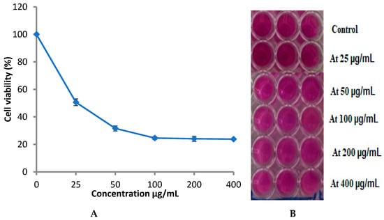 Therefore, the extract of P. rubens was tested against prostate cancer (PC-3) proliferation. The anticancer activity test showed that P. rubens extract exhibited inhibitory activity towards PC-3 proliferation in a dose-dependent manner (Figure 9), where the cell viability decreased with the increase in the extract concentration. At 25 µg/mL, cell viability was 50.60%, while at 200 µg/mL and 400 µg/mL, the cell viability was 24.09% and 23.80%, reflecting mortality levels of 75.91% and 76.2%, respectively. Hence, the obtained findings also indicated that the endophytic fungus P. rubens, of marine habitats, has acceptable inhibitory activity for PC-3. A. niger and P. rubens displayed the highest anticancer activity against a colon cancer cell line (HCT-116) [42]. In a previous study, inhibition of HL-60 and A-549 cell line proliferation may have been to chloctanspirone A, as identified by Bladt et al. [43] in P. rubens extract.