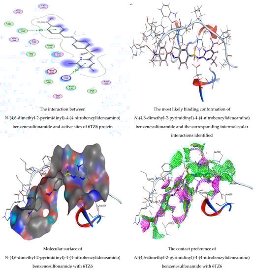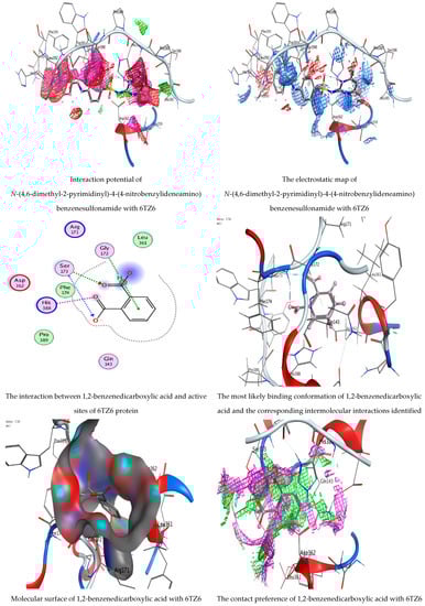 Molecular docking process of N-(4,6-dimethyl-2-pyrimidinyl)-4-(4-nitrobenzylideneamino) benzenesulfonamide and 1,2-benzenedicarboxylic acid with 6TZ6 protein.