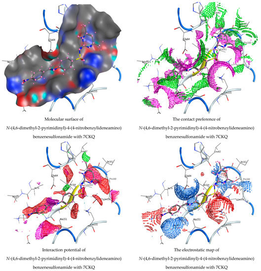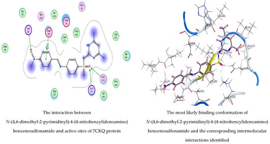 Molecular docking process of N-(4,6-dimethyl-2-pyrimidinyl)-4-(4-nitrobenzylideneamino) benzenesulfonamide and 1,2-benzenedicarboxylic acid with 7CKQ protein.