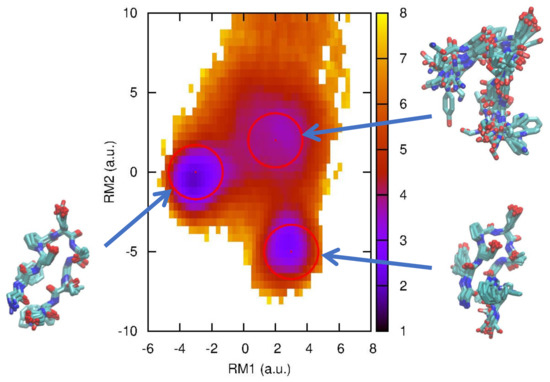 Directly related to our study, one of the authors (A.M.) performed an MD simulation of the original chignolin near its folding transition temperature and showed the effectiveness of relaxation mode analysis (RMA) [38], which extracts slow relaxation modes and their associated timescales from simulation data. Historically, RMA was developed to examine the “dynamic” properties of spin systems [13] and homopolymer systems [14,15], but has also been recently applied to biomolecular systems [16,17,38]. (RMA is similar to time-structure-based independent component analysis (tICA) in [18,19,20], but tICA is a special case of RMA with = 0. From RMA, the concept of slow relaxation is naturally introduced. See the conclusion of [16] for more details about the difference between tICA and RMA.) In [38], the free energy landscape using slow modes obtained by RMA was calculated and an intermediate state was found in addition to the previously found native and misfolded states, as shown in Figure 1. Here, we use the same trajectory data of chignolin in [38], so the setup of the molecular dynamics calculation is the same as well [38]. An MD simulation, augmented by a GPGPU, was performed using the AMBER package (AMBER 11.0) with the ff99SB force field and TIP3P water model. An extended structure was solvated with a 15 Å buffer of TIP3P water around the peptide in each dimensional direction. The numbers of atoms of the peptide and water molecules are 138 and 10,941 (3647 water molecules), respectively. Two potassium ions (Na) are included in the system, resulting in a net-neutral system. The total number of atoms in the system is 11,081, and a 750 ns MD production run at 1 atm pressure and a 420 K temperature (near folding temperature) was performed with a time step of 2 fs. The Langevin thermostat with a friction constant ps was used for temperature control. For analysis, the coordinates were saved every 10 ps, and the total number of samples was 75,000. The free energy landscape of chignolin along the first and second slowest relaxation mode (RM) directions is shown in Figure 1.