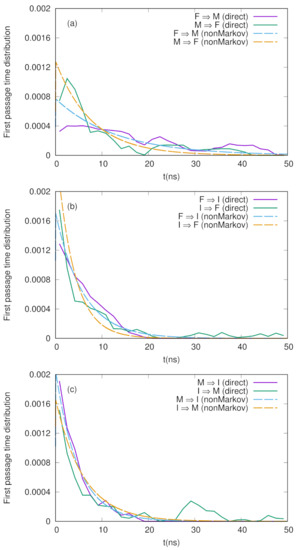 We here evaluate the first passage time distributions (FPTDs) using the non-Markov-type analysis introduced above. From the free energy landscape in Figure 1, we define three, folded (F), misfolded (M), and intermediate (I), states whose centers are (−3.0, 0.0), (3.0, −5.0), and (2.0, 2.0), respectively with a radius of 1.4 (the rest is regarded as an unfolded state). We then count the transitions between these states and construct the conditional transition matrix with a lag time of 10 ps. Using Equations (3) and (4), we can calculate the first passage time distribution and MFPT, respectively. For comparison, we also employ a “naive” method to calculate the first passage time distribution as follows: We pick , which is classified as state A, and then, search along the time series when it makes a first transition to state B. When it happens at , we then calculate the FPT from state A to B as where is the lag time.
