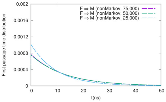Sample number dependence of the first passage time distribution for the F → M transition. The numbers of samples used here are 75,000, 50,000, and 25,000.