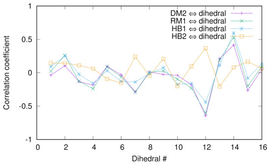 Previously, we employed the diffusion map (DM) method to extract the collective variables (CVs) of chignolin [10] and discussed the correlation between a dihedral angle of glycine and the DM coordinates and relaxation mode (RM) coordinates. To look into more detail of such correlations, we calculated the Pearson correlation coefficients between several collective variables (second DM coordinate, first RM coordinate, and two hydrogen bond distances between Asp3O and Gly7N named HB1 or between Asp3N and Thr8O named HB2) and 16 dihedral angles () of chignolin in Figure 4. For the numerical protocols for the DM and RM coordinates, see the previous papers [10,38]. We see that except HB2, the correlations are good, indicating that HB1 is a “good” CV since we know that the second DM and first RM coordinates are good CVs. In addition, the absolute values of the coefficients are the largest at the 12th and 14th angles (except HB2), which are the ’s of glycine and threonine, indicating the importance of these two residues for conformational change.