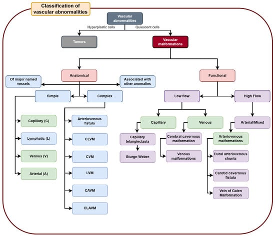Between 40% and 60% of vascular anomalies occur in the head and neck region, mostly affecting the nervous system [2,11]. The way to approach these anomalies depends on the specific characteristics that they exhibit [8]. Therefore, it is important to know the main characteristics of simple group vascular malformations, according to ISSVA criteria, which are present in the nervous system, to achieve correct identifications, characterizations, and therapeutic approaches (Figure 1). This information is obtained by clinical anatomical imaging (angiography and magnetic resonance imaging) and histopathological analysis.