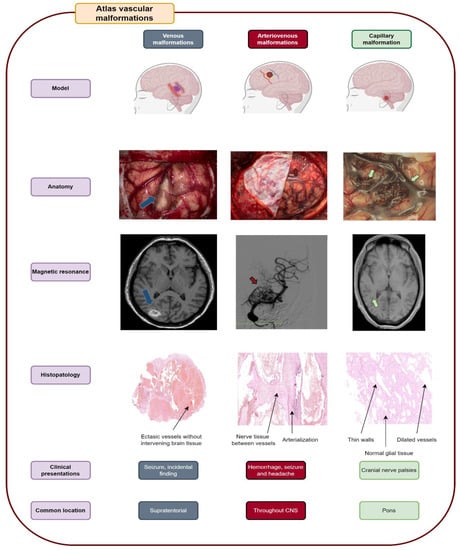 The main topics addressed in this systematic review from the points of view of the model, anatomy, magnetic resonance imaging, histopathology, clinical presentation, and common location [13]. The representative image of venous malformation shown in the figure is cavernoma; the representative image of arteriovenous malformation is a temporal lobe malformation; the representative capillary malformation is capillary telangiectasia.
