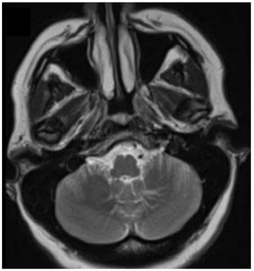 - Rosenblum, J.S.; Nazari, M.; Al-Khalili, Y.; Potigailo, V.; Veznedaroglu, E. Unilateral symptomatic hypertrophic olivary degeneration secondary to Midline brainstem cavernous angioma: A case report and review of the literature. World Neurosurg. 2018, 110, 294–300. [Google Scholar] [CrossRef] [PubMed]